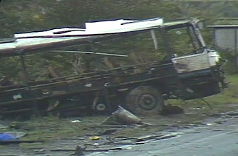 As it is driving along the main road from Ballygawley to Omagh, at about 12:30 a.m., IRA members remotely detonate a roadside bomb containing 200 pounds (91 kg) of Semtex. According to police, the bomb had been planted in a vehicle by the roadside and had been detonated by command wire from 330 yards (300 m) away. A statement by one of the survivors claims instead that the roadside bomb was made of “two fertilizer bags filled with Semtex.” The blast hurls the bus 30 metres down the road and throws the soldiers into neighbouring hedges and fields. It leaves a crater 6 feet deep and scatters body parts and twisted metal over a wide area. Witnesses describe finding dead, dying and wounded soldiers strewn on the road and caught in the wreckage of the bus. Others are walking around “stunned.” Some of the first to arrive on the scene and offer help are loyalist bandsmen of the Omagh Protestant Boy’s Band returning from a parade in Portadown, who have also been traveling in buses.